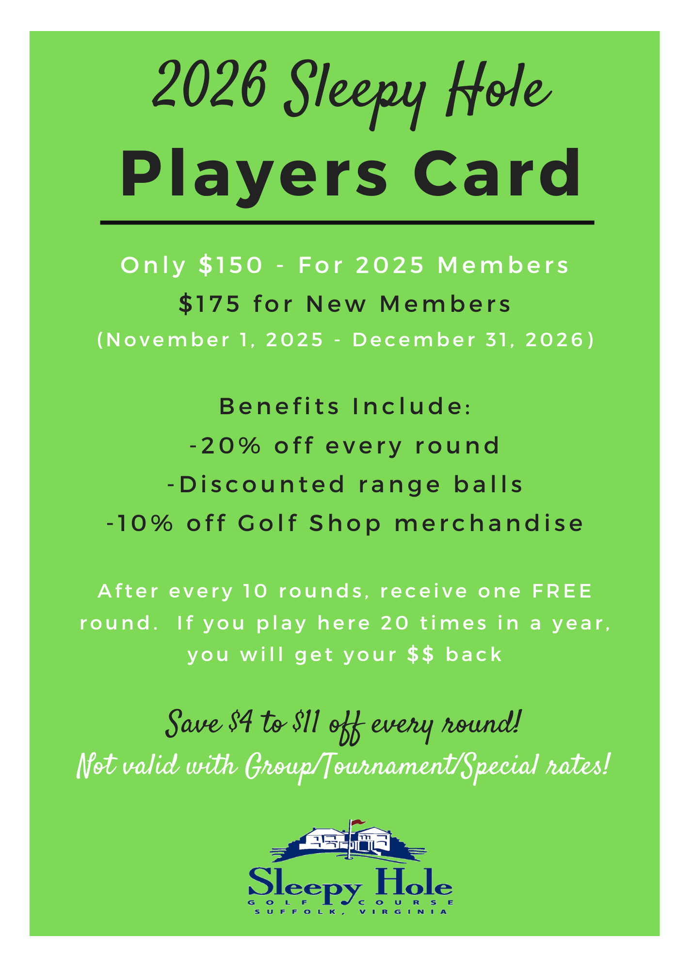 A great option for those who love to play Sleepy Hole frequently! Show this card to our staff when you arrive, and enjoy the savings. No Monthly Fees!!